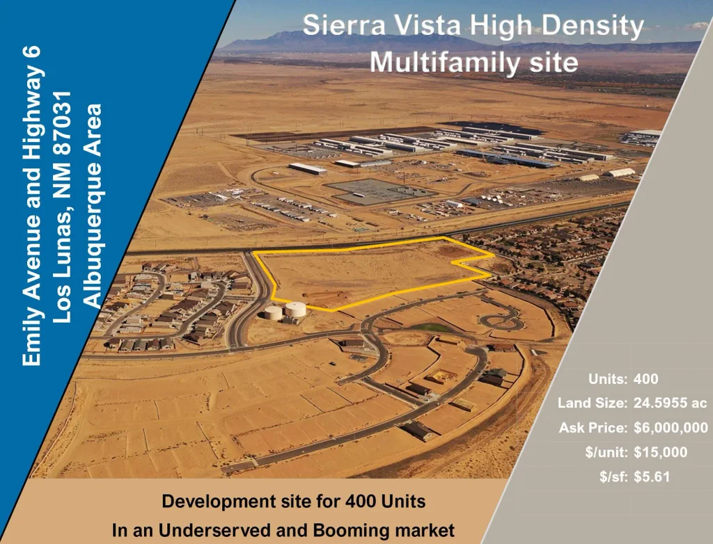 This site is part of the Sierra Vista Area plan which covers a larger 272.3 acre master plan which is located just north of Cerro de Los Lunas Preserve in Los Lunas, NM. The site is adjacent one of the highest concentration of employment growth in the area with a new Amazon distribution facility, Meta/Facebook data centers, Wal-mart distribution center and a planned rail park.Located across the main highway from the Meta/Facebook Data Centers, Wal-Mart distribution center and Amazon distribution center, this site has a captive audience of potential renters, most of whom head north to Albuquerque in the daily commute to find housing.''The site is fully entitled and build ready. Mass grading is done, and all utilities are available at the street or stubbed into the site. for 400unit