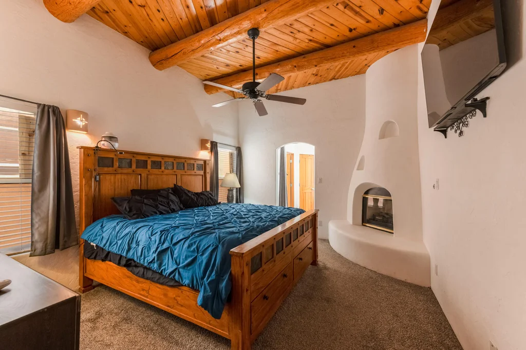 Located in a gated community. You can really live New Mexico in this home with so many charming Southwest features including a courtyard entry, carved posts, viga ceilings, and 2 kiva fireplaces! Cozy Living room with raised ceiling, tongue and groove wood ceiling and, vigas, kiva FP and patio door to rear yard. Pleasant kitchen great U configuration for cooking, gas stove and breakfast bar as well as a rounded wall of windows in dining area, Fall asleep in peaceful primary bedroom with kiva frplc. Generous bath with soaking tub, sep shower and double sinks. 2 additional bdrms on opposite of home with a bath in between. Attached 2 car garage. Rear patio has a fireplace too. Refreshed stucco and refreshed roof.