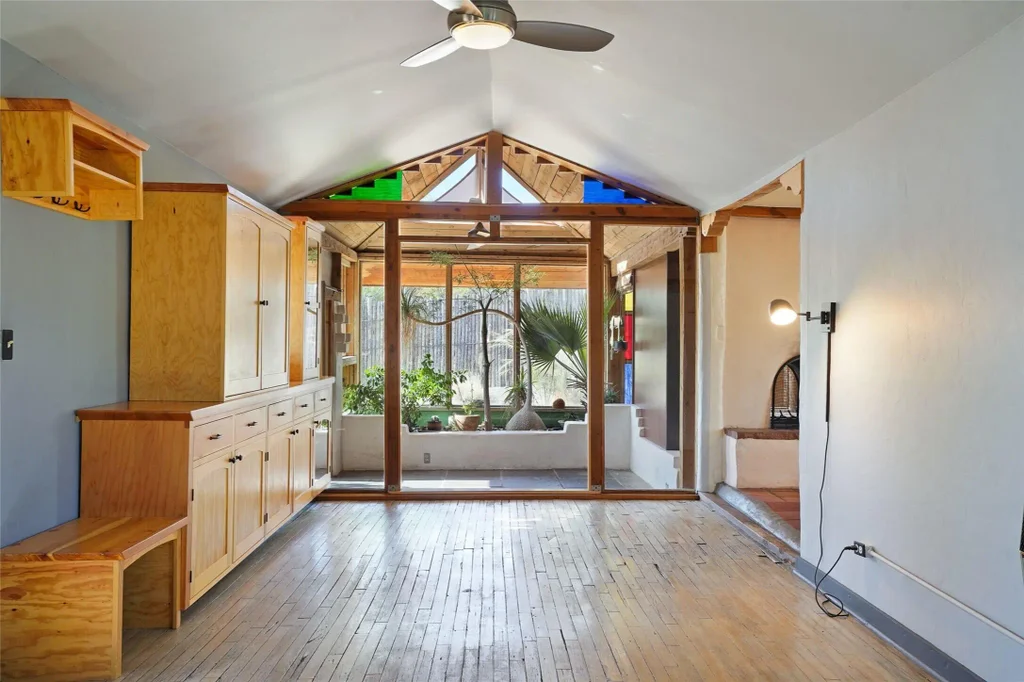 Nestled in the heart of historic Madrid village and close to the County greenbelt, this unique .64-acre property offers a blend of charm and functionality. It features a 972-square-foot artistic main home, a 443-square-foot studio complete bath with shower and sink, and a bright, spacious 750-square-foot workshop. The workshop is equipped with a wood stove for heating and a mini-split system that also provides heating and cooling. The main home showcases partial adobe construction, a sunlit atrium, a two-way kiva fireplace, and a bathroom featuring a clawfoot tub. The property consists of two legally recorded lots. Both the studio and the main house open to an expansive fenced yard with secure coyote fencing, ideal for pets.