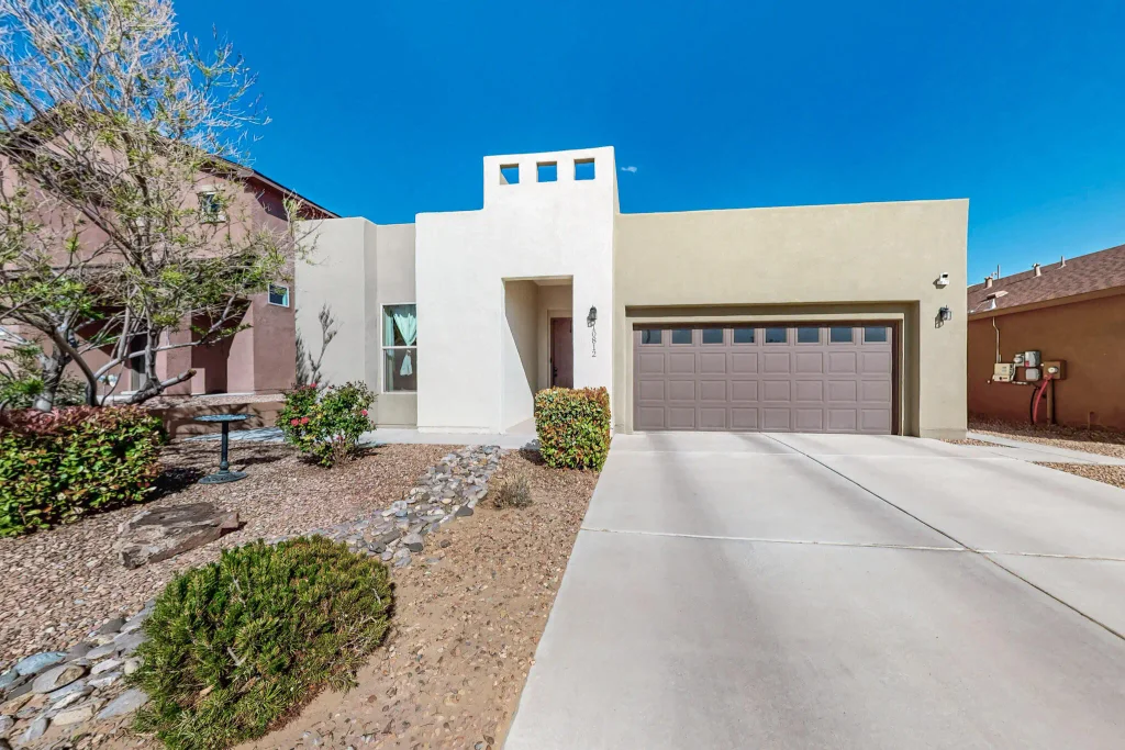 Better than new! This stunning Raylee Contemporary in NW Albuquerque offers 3 bedrooms, 2 baths, and thoughtful upgrades throughout. The chef's kitchen features quartz countertops, charcoal cabinetry, tile backsplash, built-in coffee bar, and a kitchen island with additional cabinet space. Staggered tile floors in main areas and new vinyl wood floors in all bedrooms--no carpet! Luxurious tiled baths with cultured marble. Enjoy your private backyard oasis with an east-facing covered patio, lush landscaping, custom flowerbeds, sandstone caps, and a soothing fountain. Includes tankless water heater, central heat, and refrigerated air. Move-in ready with no costly upgrades or delays--just unlock the door and enjoy!