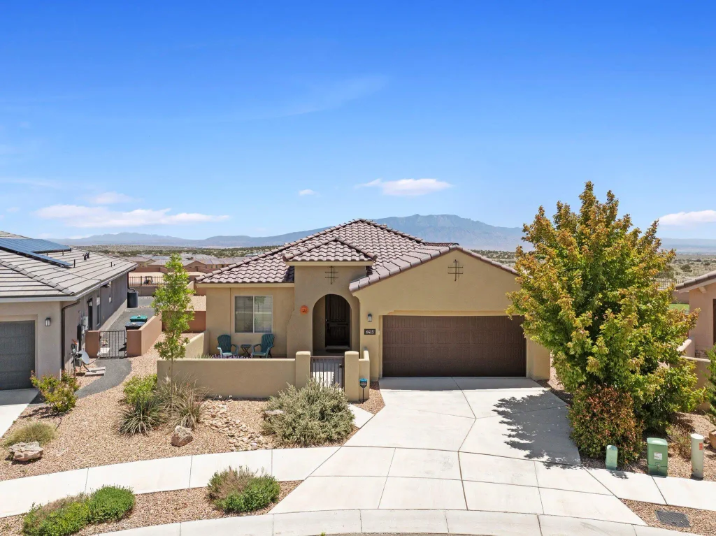 Stunning single story home perched on a rare, elevated lot in the gated section of Mariposa with breathtaking views of the Sandias and city lights. 3 bedroom plus an office & flex space + an extra large garage. Great curb appeal and welcoming courtyard sets the tone. Inside you're greeted with beautiful ceramic tile & engineered hardwood adding warmth and style. The gourmet kitchen features granite countertops, built in appliances, custom backsplash and lighting. Open concept layout with massive backdoor sliders that highlight the views from the large backyard patio! Primary suite is extra large with ensuite bathroom including a tiled walk in shower and generous closet. Tile roof, cul de sac, 8' doors, 1/4 acre lot + more! Access to clubhouse, pools and trails!