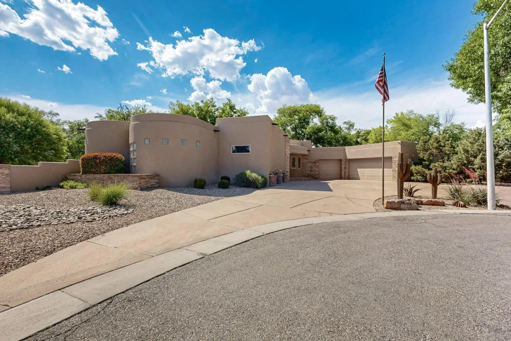 Stunning Eric Spurlock design in Albuquerque's prestigious North Valley, nestled at the end of a private cul-de-sac with private gate access to the walking trail along the Duranes Lateral. This luxury home boasts 12' ceilings, refrigerated and humidified air, recirculating softened water, and a solar-owned system. The primary suite includes a fireplace, flex space, and a spa-like ensuite with a walk-in shower for two, his/her commodes, and a bidet. Entertain in style from intimate gatherings to large parties. The open floor plan creates a seamless transition to the game room with wet bar, ice maker, and mini fridge or outdoors to the expansive covered patio, grill, fireplace and putting green. Backyard gate access to the ditch walking path. RV parking possible, and a cooled, 4-car garage.