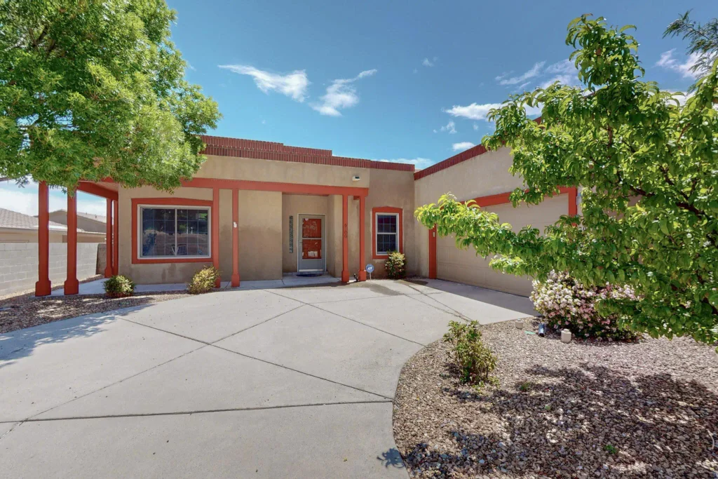 Seller will give a $5,000 CREDIT towards buyer's closing costs with an acceptable offer. Located in the Petroglyph Shadows neighborhood. This 4-bedroom, 2.5-bath home sits on corner lot, in a pocket neighborhood boasting an open floor plan, updated Renewal by Anderson windows, owned solar panels, low monthly PNM bill, refrigerated air & a whole house water filtration system, blending Southwest charm with modern living. Enjoy hand scraped engineered wood floors, updated light fixtures and architectural details like vigas and corbels in the living and dining rooms, an adobe accent wall separating the two living areas, and a cozy kiva-style gas log fireplace in the family room. Clerestory windows bring in abundant natural light. The kitchen is both stylish and functional, offering granite