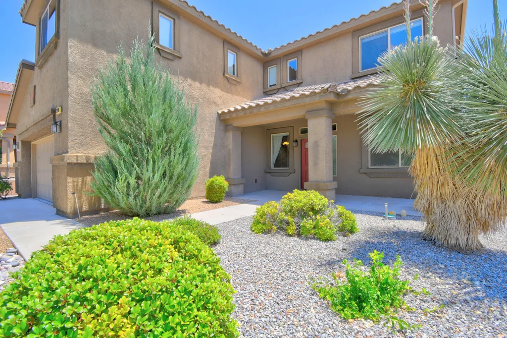 Welcome to this spacious 5-bedroom, 3-bath home in the highly desired Cabezon community! Boasting 3,558 sq. ft. of open-concept living, this beauty features two living areas, two dining spaces, a huge loft, tall ceilings, and a lovely gourmet kitchen with an island and abundant cabinetry. Elegant wrought iron stair railing adds a touch of sophistication. The large primary suite offers a massive walk-in closet and a stylish updated bathroom. Enjoy relaxing evenings on the oversized patio backing to the Linear Park Trail, complete with a hot tub & water feature! An oversized garage provides extra storage. This home truly has it all--space, style, and location! It's the perfect place to hang your heart! Great lot with no neighbor directly behind and views of the Sandia's.