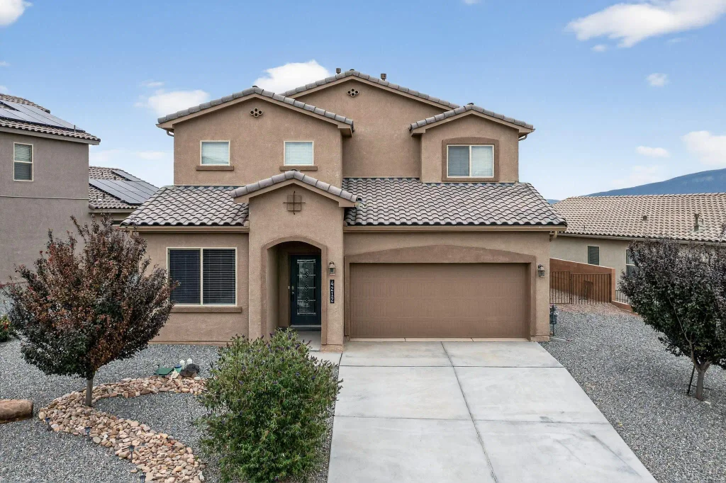 Experience elevated everyday living with stunning Sandia Mountain views & a beautifully landscaped backyard featuring an extended patio, low-maintenance newer turf, a private hot tub & evening shade. The main-level primary suite includes a walk-in shower, generous closet space, and direct access to the laundry room. A dedicated flex room is perfect for a home office or creative space. The open living area features soaring ceilings and large windows that create a bright, airy feel. At the center of the home, the sleek kitchen offers stainless steel appliances, a spacious island, and ample cabinetry. Upstairs, you'll find a large loft, a private guest suite with its own bathroom, & two additional large bedrooms. Designed for comfort & style!