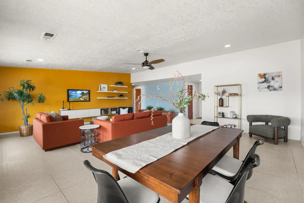 This beautifully updated Mid-Century Modern ranch sits on a spacious half-acre lot in the heart of Rio Rancho, offering a rare blend of space, style, and location. Home has been thoughtfully updated throughout! Inside, you'll find two oversized living areas, including a cozy family room with a brick fireplace and direct backyard access. The light-filled kitchen features a modern remodel with open flow to both dining and living spaces--perfect for everyday life and entertaining. A large laundry room and extra storage add convenience. Outside, enjoy ample space for gardening or future projects, plus a backyard storage unit. Conveniently located with easy access to Albuquerque, shopping, and dining.