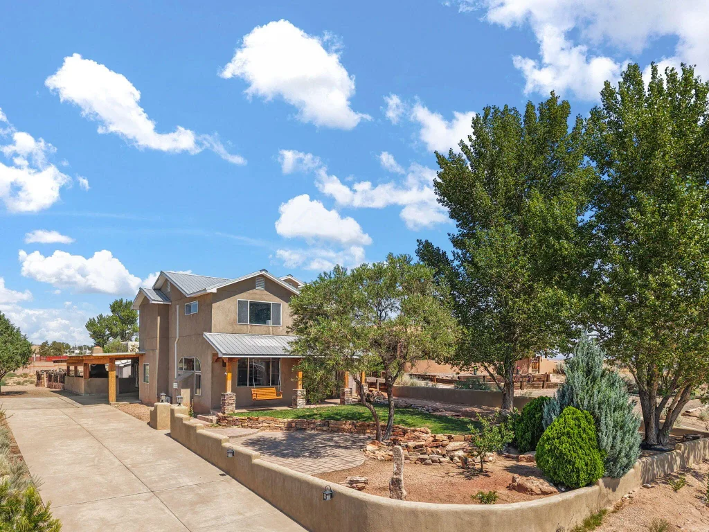 Experience the magic of Northern New Mexico living in this beautifully updated home, where fresh white paint and rich wood casework frame every doorway and window. Brick and solid floors bring timeless charm, while 5 energy-efficient mini-splits ensure year-round comfort. A versatile bonus room with heating and cooling expands your living options. Step outside to breathtaking, unobstructed mountain views, open skies filled with hot air balloons, and outdoor spaces designed for gathering--complete with a cozy fireplace and fire pit. Rosemary bushes, a small apricot tree, and a quiet street enhance the peaceful setting. Thoughtful touches include dog doors to a dedicated run and a spacious garage. Just 5 minutes to the Rio Grande, parks, shopping, and top-rated schools. See it soon!
