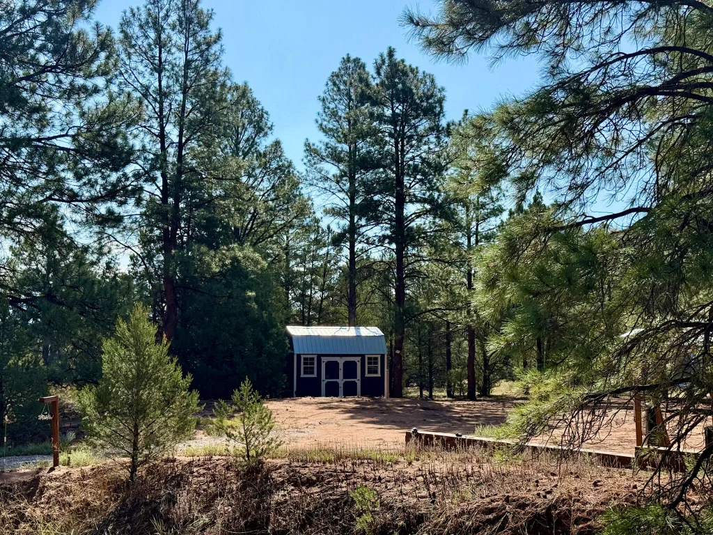 Cliff views and privacy on this well-equipped and heavily wooded 5 acre parcel in upper Timberlake Ranch! Recent additions include two 30 amp RV parking spots, a 14x20 metal gazebo and 16x10 shed, both with buried electric, and a playground and trampoline for the kids. A 2500 gal water tank and septic system are also in place. Fenced and gated front, with a long gravel driveway winding to the back of the property across a small arroyo. The colorful cliffs of Cibola National Forest are visible through the ponderosa pines, and thoughtful driveway design provides a sense of privacy and seclusion throughout the property. Local water hauling available, HOA dues are only $230/year, roads maintained year round, Fire/EMT less than 3 miles away. Fresh air and cool temps just 2.5 hours from Abq.