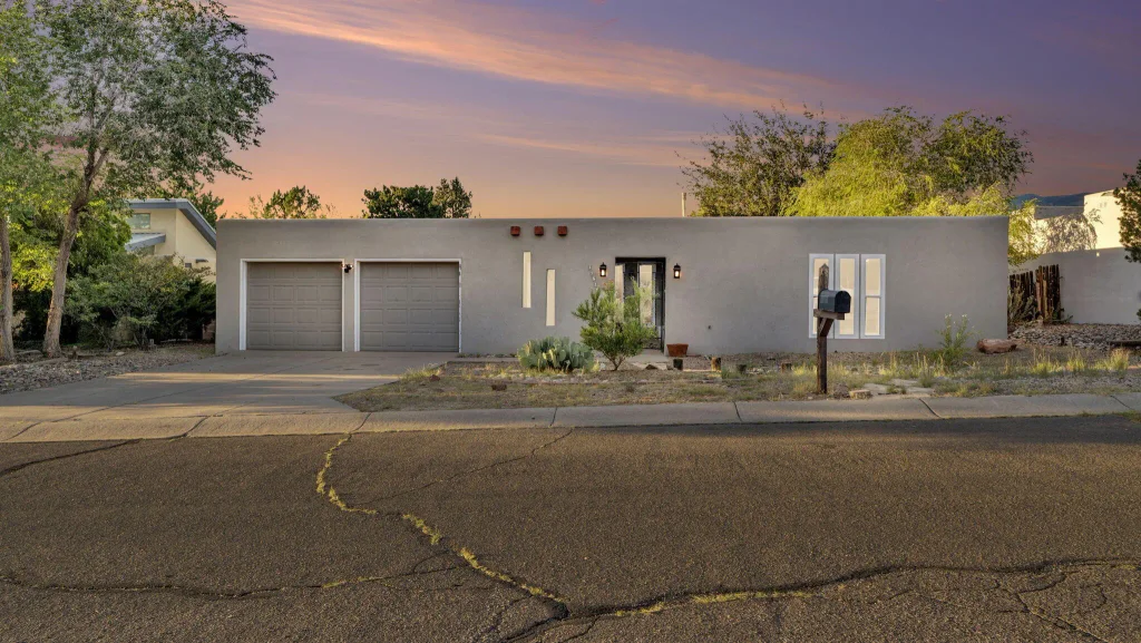 Welcome to this 4-bedroom, 2-bath Pueblo Revival style home with contemporary updates, ideally located in the NE Heights. The inviting entry opens to a spacious living room with a stone-accented fireplace, built-in shelving, and wood-look tile throughout. The updated kitchen offers natural wood cabinetry, quartz countertops, stainless steel appliances, and plenty of storage. Bedrooms are filled with natural light, offering flexible layouts for work or relaxation. Step outside to a beautifully landscaped backyard with a covered patio, raised garden beds, artificial turf, and a storage shed. Enjoy peace of mind with a newer TPO roof, heating, and refrigerated air. A two-car garage adds convenience. Don't wait--homes like this move fast, so act now to make it yours!