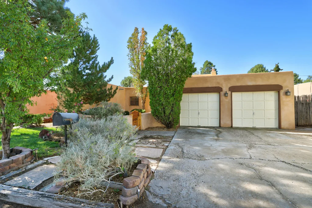 Discover this distinctive North Valley home filled with charm & character. You'll be captivated by its authentic Southwest appeal featuring cement floors, vigas, beams, & a cozy kiva fireplace. Designed for flexibility, the home offers 3 spacious bedrooms with the option for a 4th bedroom or an office upstairs. Multiple living areas include a welcoming great room, an office, & a quiet library. Step outside to a private valley oasis, a beautifully landscaped yard with grass, trees, space for gardening & patios for gathering. Located near the acequia trail system for scenic trails making it a haven for nature lovers & outdoor enthusiasts. Recent updates include wood Pella windows in select areas, enhancing comfort & efficiency. This home in the coveted NV blends charm and modern living.