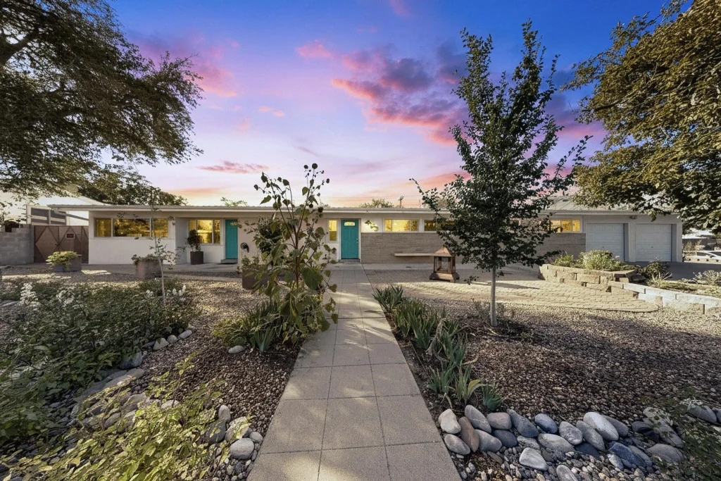 This is a super rare double-lot, mid-century modern home that was featured in the September 1954 issue of Better Homes and Gardens magazine, and custom built for the developer's wife. Beneath the owned solar, and metal roof you'll find a wonderfully light and bright home which has been recently updated, to include: An energy efficient heat pump for your A/C & heat, double pane thermal windows, newer kitchen, appliances & bathrooms, and neutral tile flooring with cozy, carpeted bedrooms. Registered as a NM farm under USDA #962, you'll also enjoy growing and harvesting your own food in the 29x32 aquaponics green house and a multitude of raised bed gardens and fruit trees including: cherries, apples, plums, peaches, pomegranates, raspberries and grape vines. Welcome to your city oasis.
