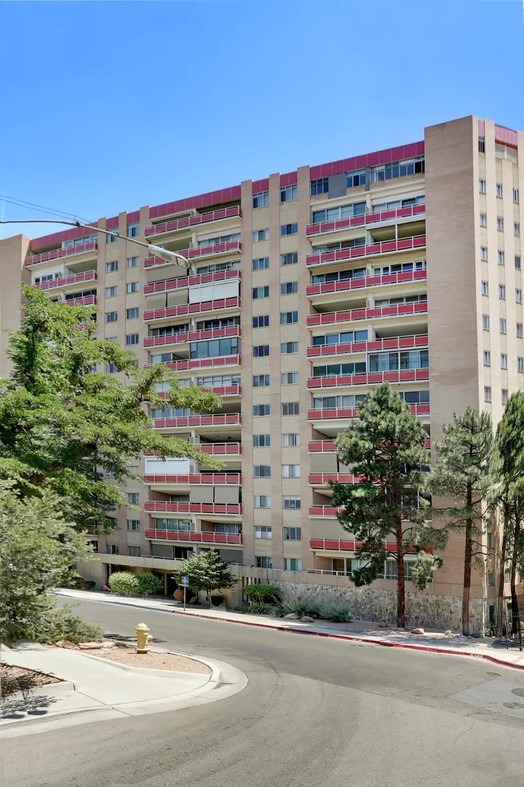 This cute one bedroom condo with a large covered outdoor patio to take in the beautiful Sandia mountain and downtown views is now available. The easy life awaits at the Park Plaza Building: you won't find a better location in town, or a more secure feel with 24 hour front desk staff and a secure parking lot. This condo comes with a covered parking space and storage locker area, lots of storage inside and it's clean as a whistle. Park Plaza has a pool, computer room/library, excellent gym, and banquet rooms available to residents for entertaining a large group. HOA fee includes utilities. You'll have as much a sense of community or sense or privacy as you like once you move in.